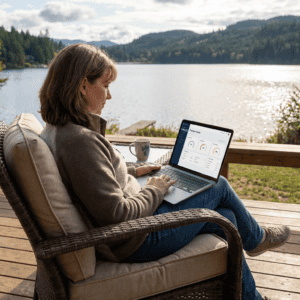 create_a_photorealistic_image_of_a_midlife_woman_sitting_in_a_comfy_patio_chair_facing_the_lake_she_jbybvzmk3sai3l3er5kj_0