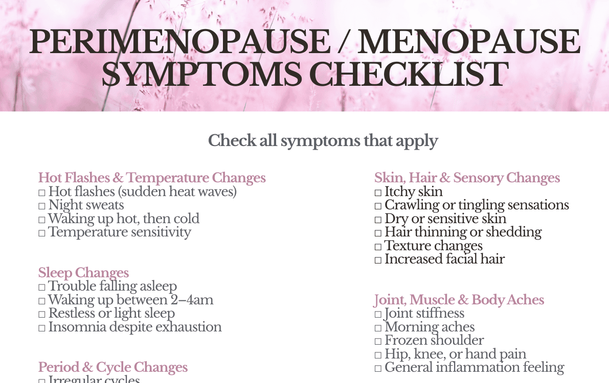 Hot flashes mood swings menopause symptoms checklist Image description: Menopause and perimenopause symptom checklist covering hot flashes, sleep issues, skin changes, hair thinning, and joint pains for midlife women.